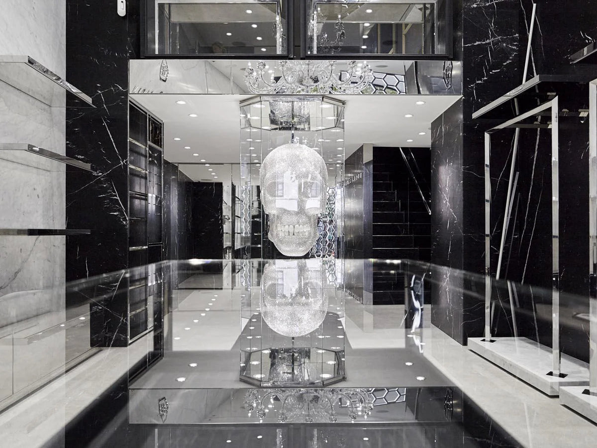 走進PHILIPP PLEIN 全球精品店店面設計呼應著簡約而奢華。和諧的白色、黑色和灰色調色板以及穆拉諾玻璃吊燈、大理石地板、時尚家具和幾何展示櫃,勾勒出大器豪門的奢華氣派,表裡如一地坐穩了高端精品的寶座。