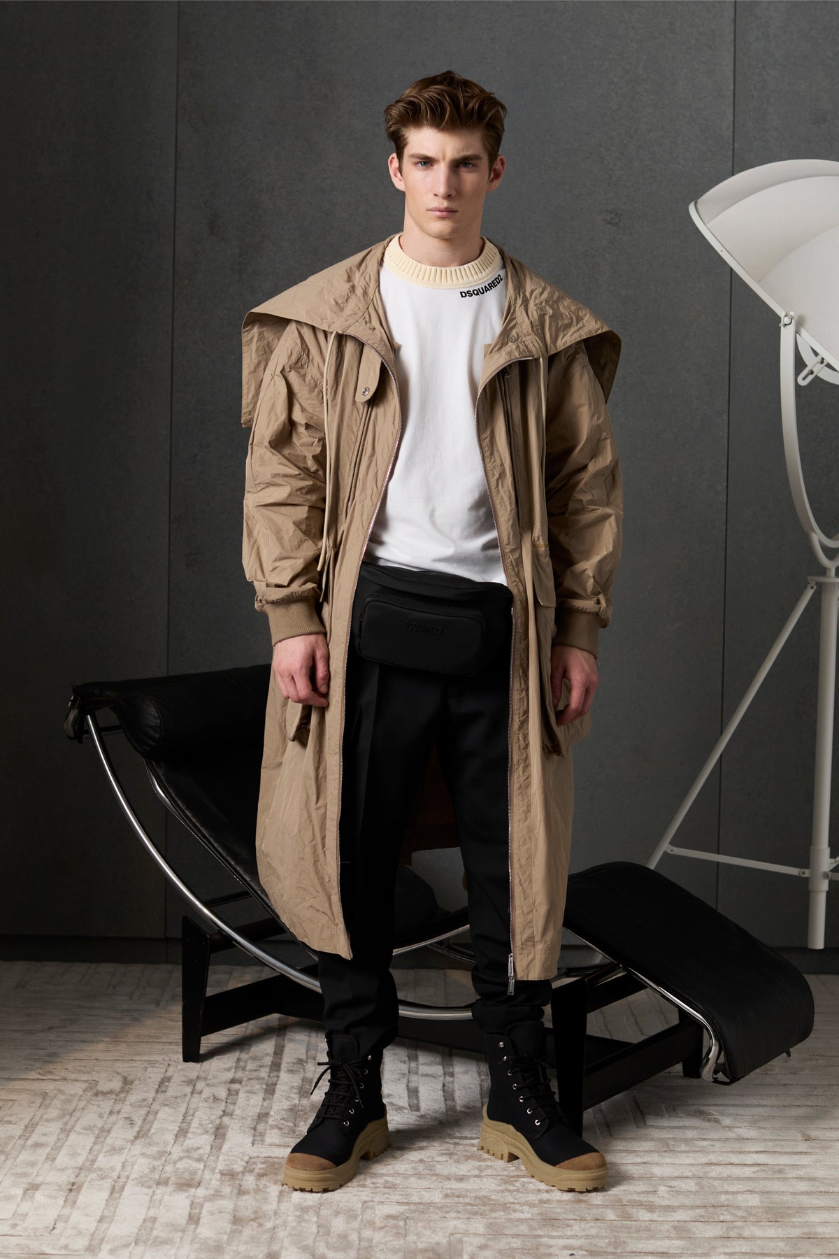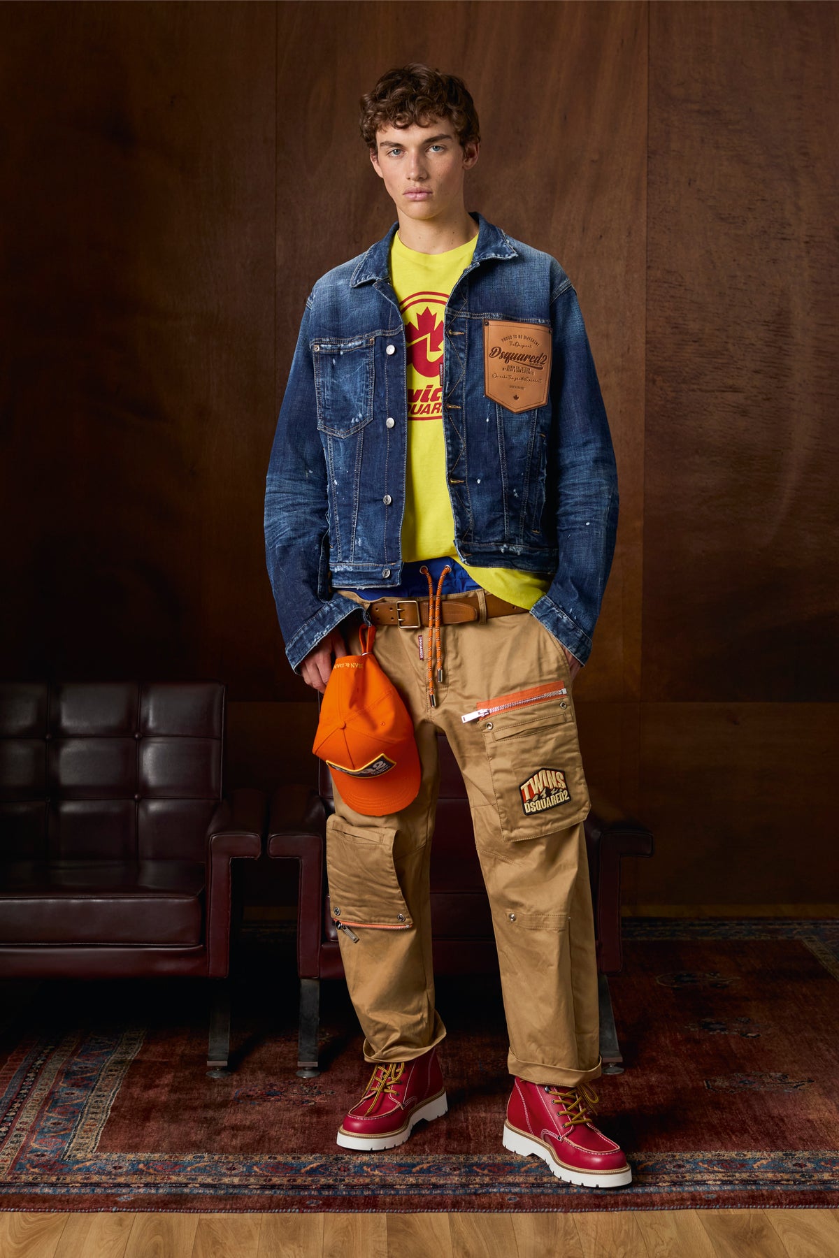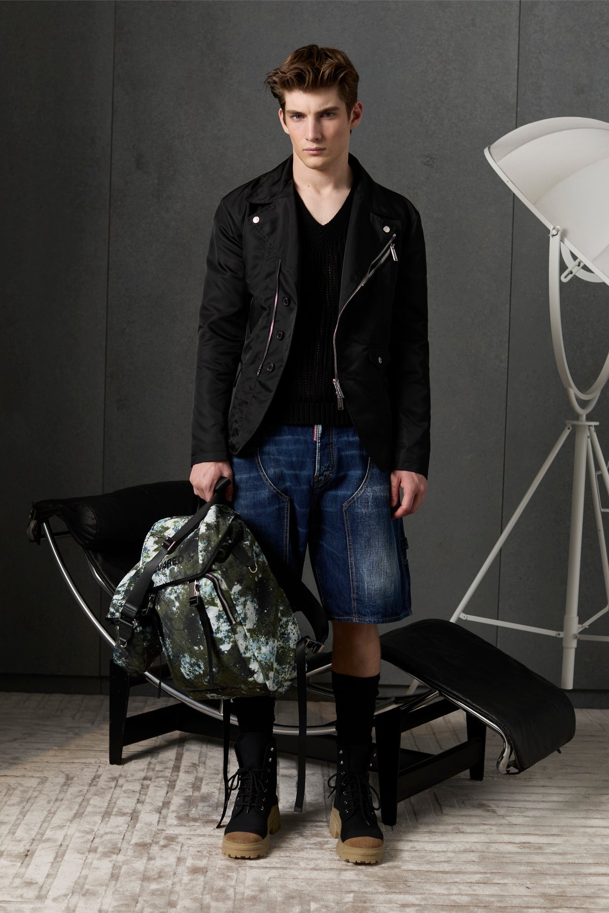 城市穿搭則將運動元素融入經典剪裁。迷彩印花點綴深藍牛仔外套與褲子,混合棉與尼龍材質的飛行夾克結合多功能設計,降落傘尼龍材質的風衣與短褲為都市探險增添輕盈感。雙層結構的丹寧外套與短褲,呈現出 Dsquared2 一貫的大膽創新風格。