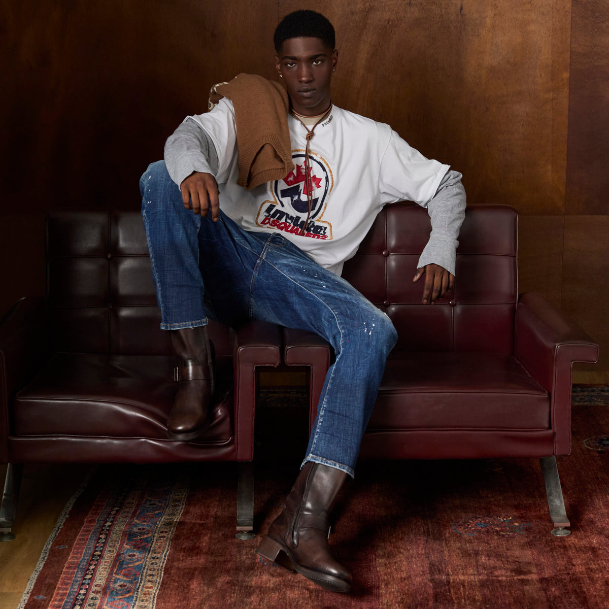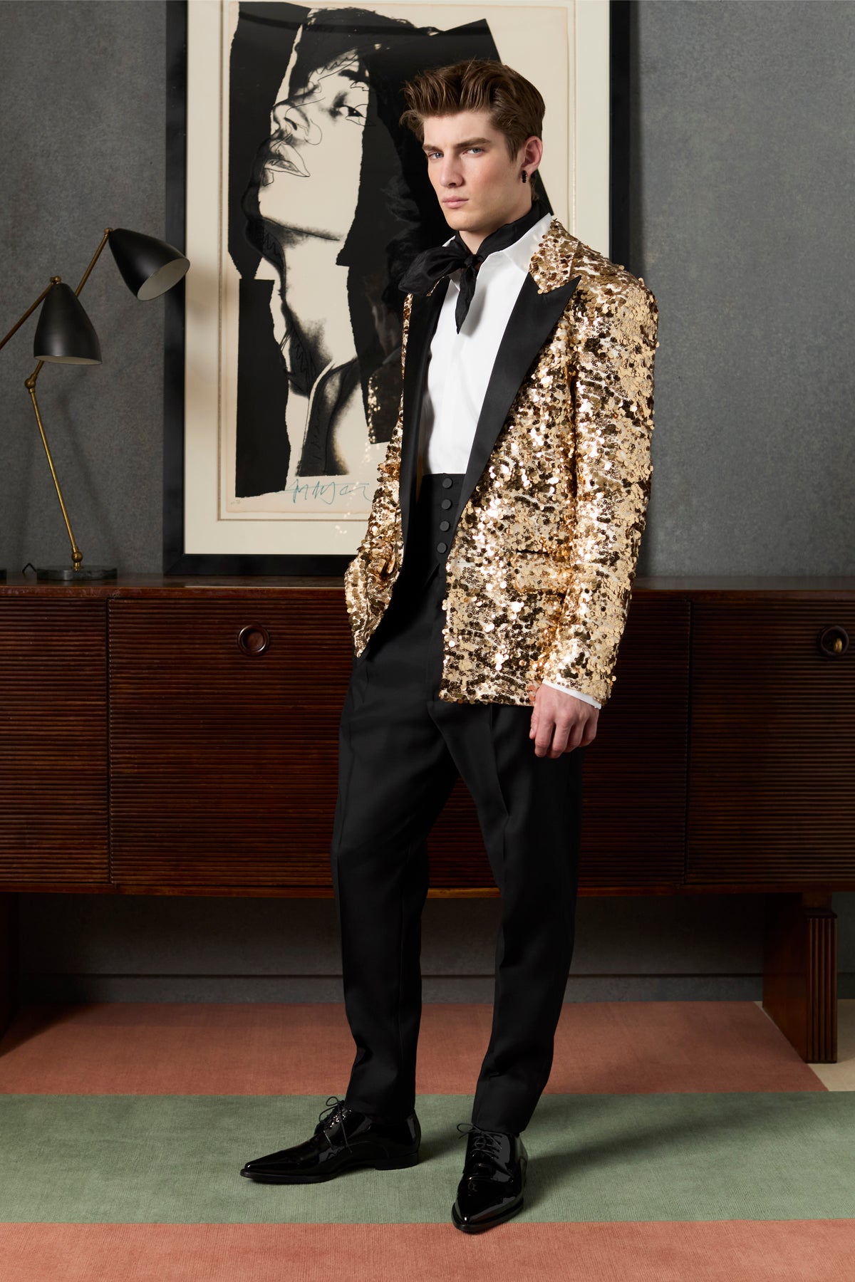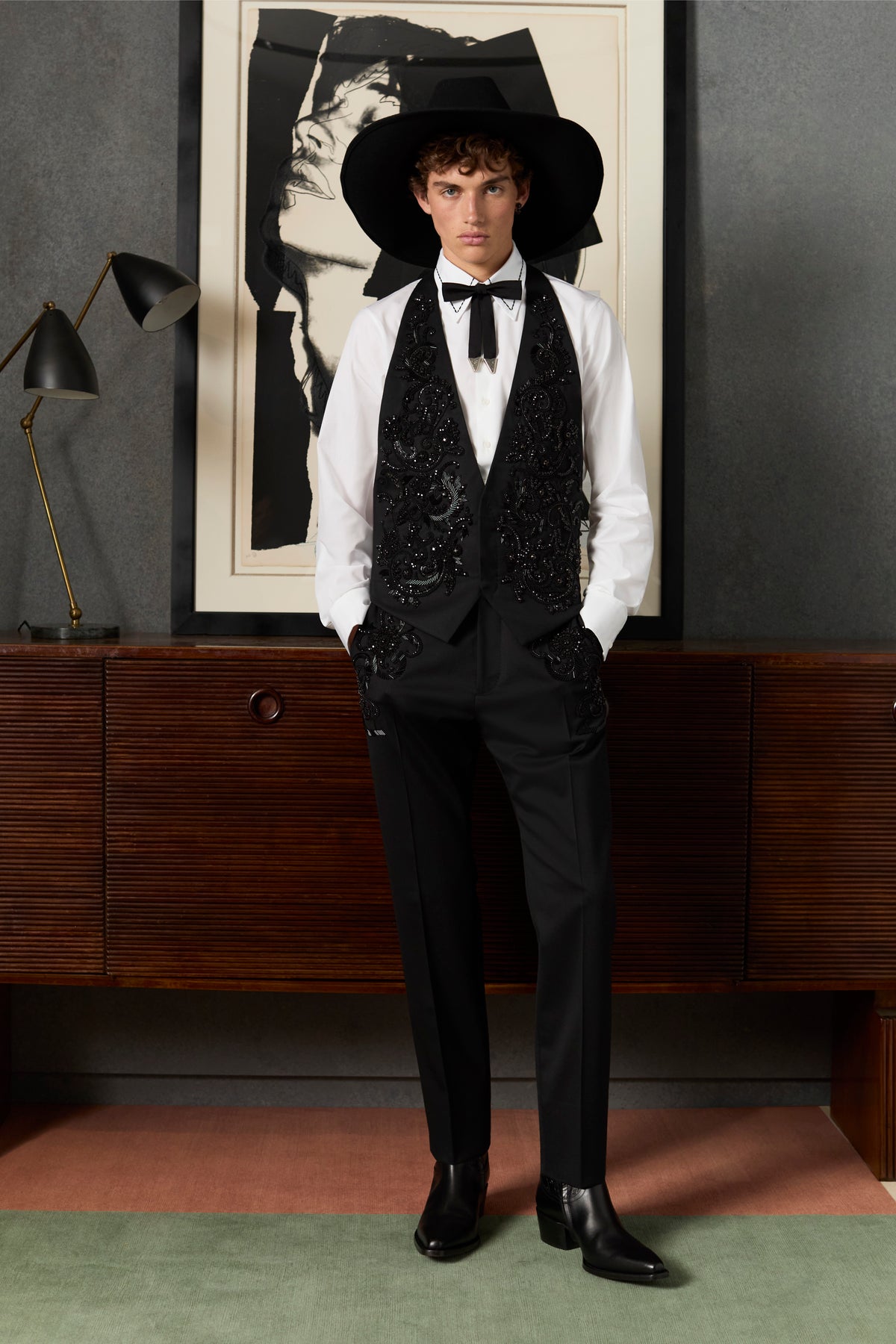 Dsquared2 男性系列以多面向的角色呈現,從戶外冒險到都市夜晚,無一不彰顯自信與獨特品味。午夜牛仔風格為晚宴造型帶來閃耀亮點。牛仔褲上裝飾有水晶圖案,西部風透視襯衫飾有珠飾蕾絲細節,搭配皮革褲與銀扣腰帶,展現迷人風範。金色亮片與黑色珠飾妝點外套與背心,讓晚間造型更具奢華氣息。