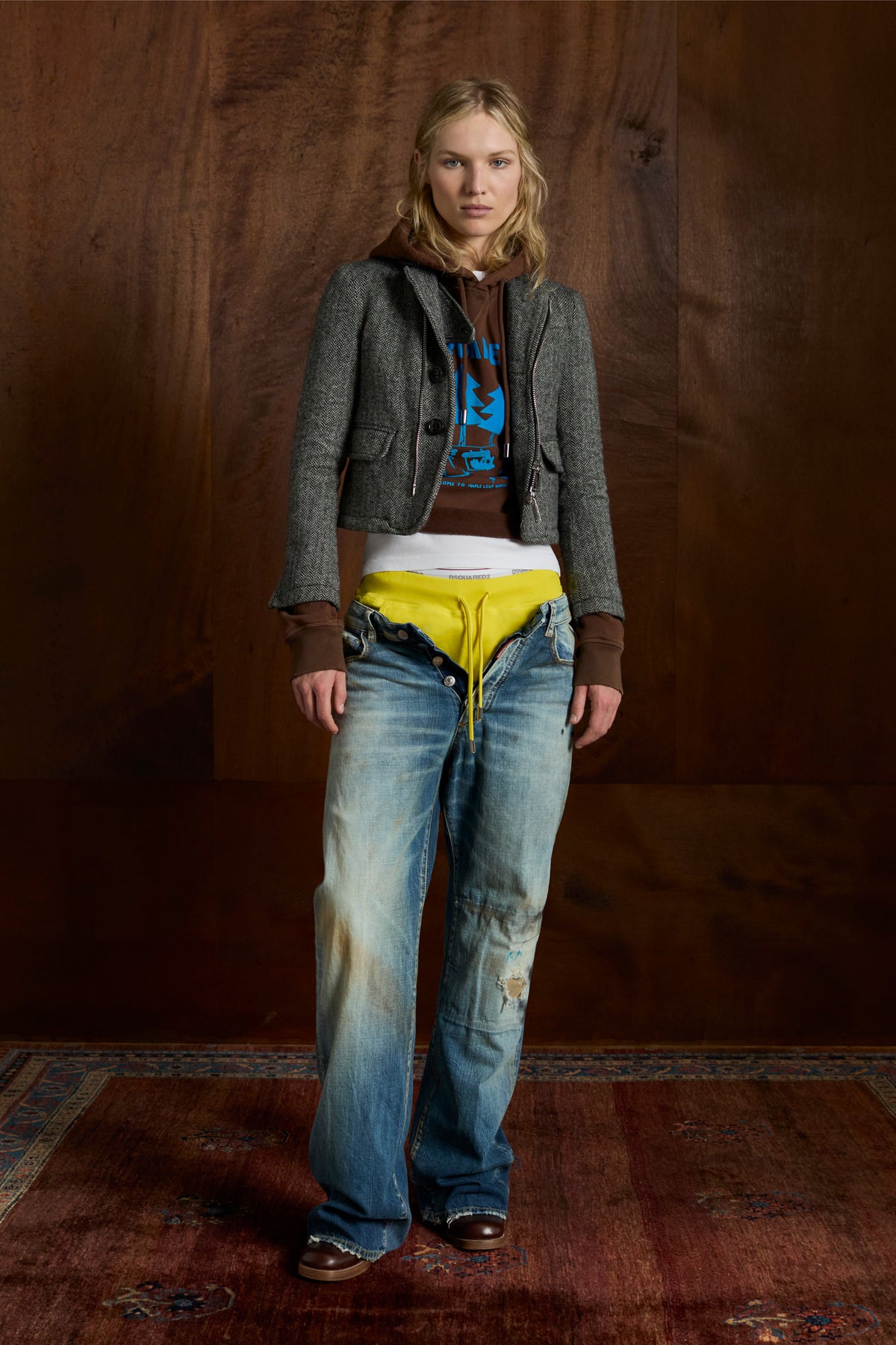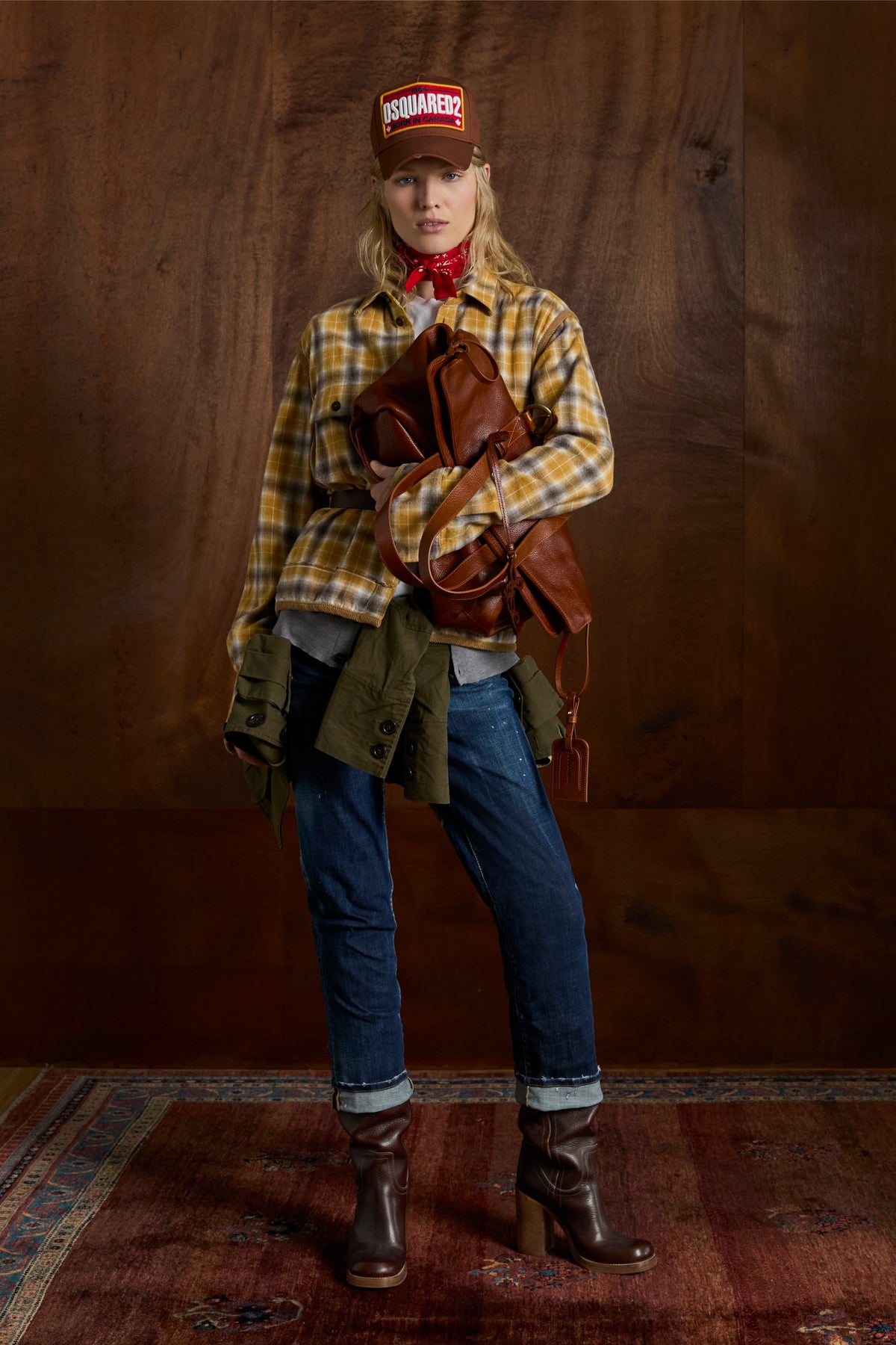 Dsquared2 女性系列從加拿大山脈的戶外徒步旅行汲取靈感,將功能性與性感風格融為一體。柔軟的格紋襯衫搭配寬鬆高腰牛仔褲,膝部磨損與白色褪色效果展現不拘一格的冒險精神。低腰卡其褲搭配短版牛仔外套或皮靴,詮釋隨性與實用並存的戶外風格。